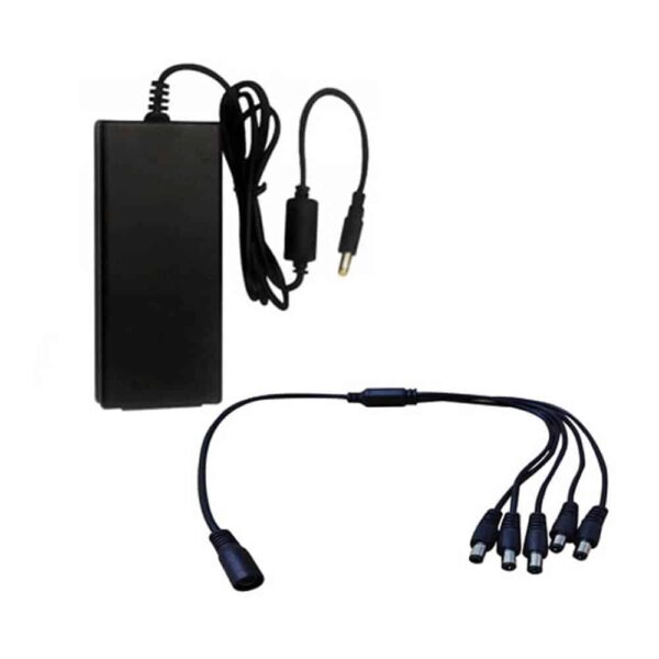 Con esta fuente y cable tipo pulpo para suministro y distribución de corriente eléctrica para 4 cámaras de CCTV , desde una sola fuente de energía. Tiene 4 conectores machos de 2.1mm para las cámaras y un conector hembra para la fuente.
