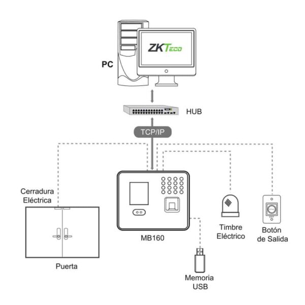 - Función ADMS incluida. El MB160 está listo para trabajar con el software BIOTIMEPRO, facilitando la administración de personal en sitios remotos de manera centralizada.